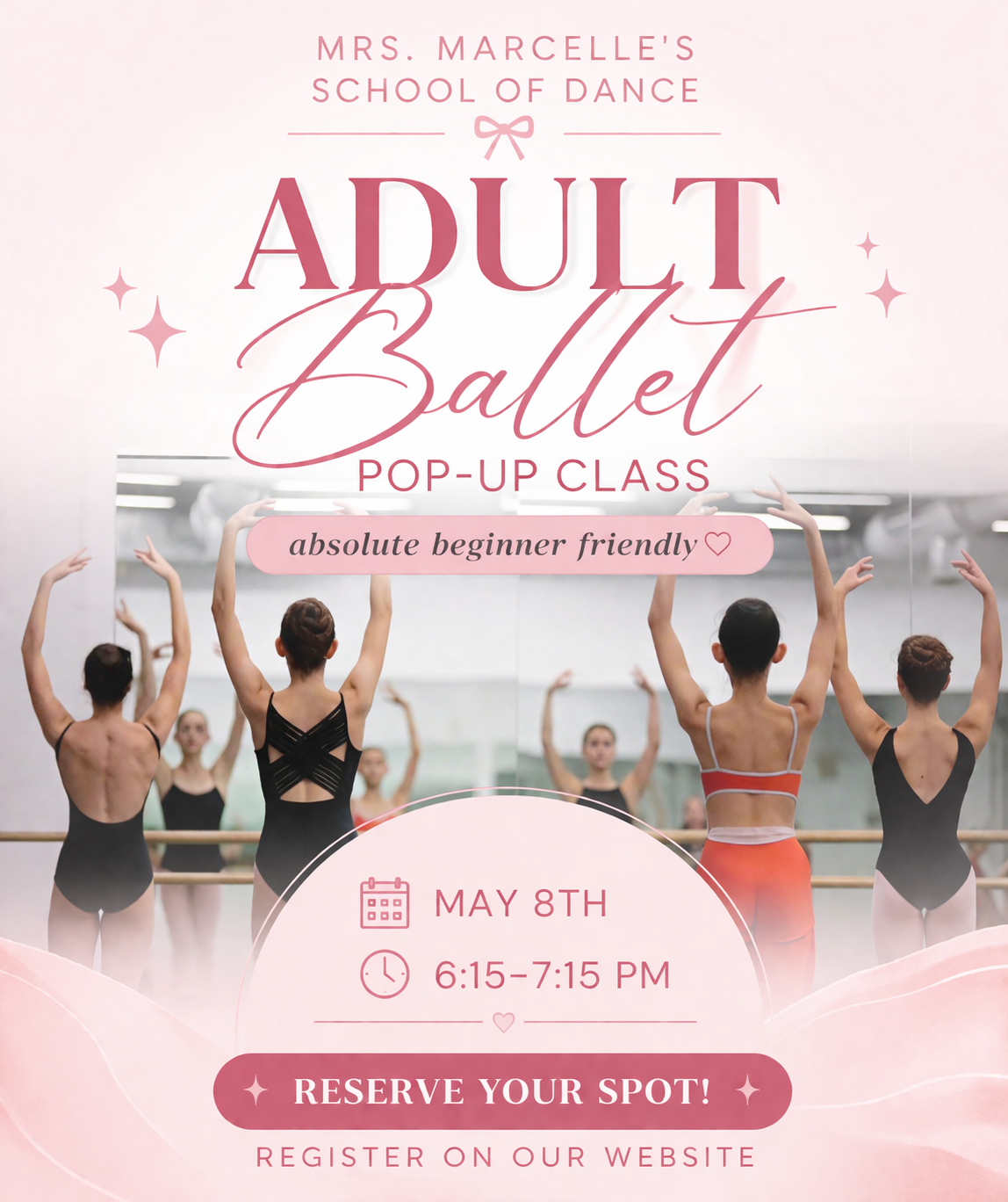 We offer: Ballet, Tap, Hip-Hop, Lyrical, Pom, Pointe, Adult, Tumblenastics, and Mini & Me.